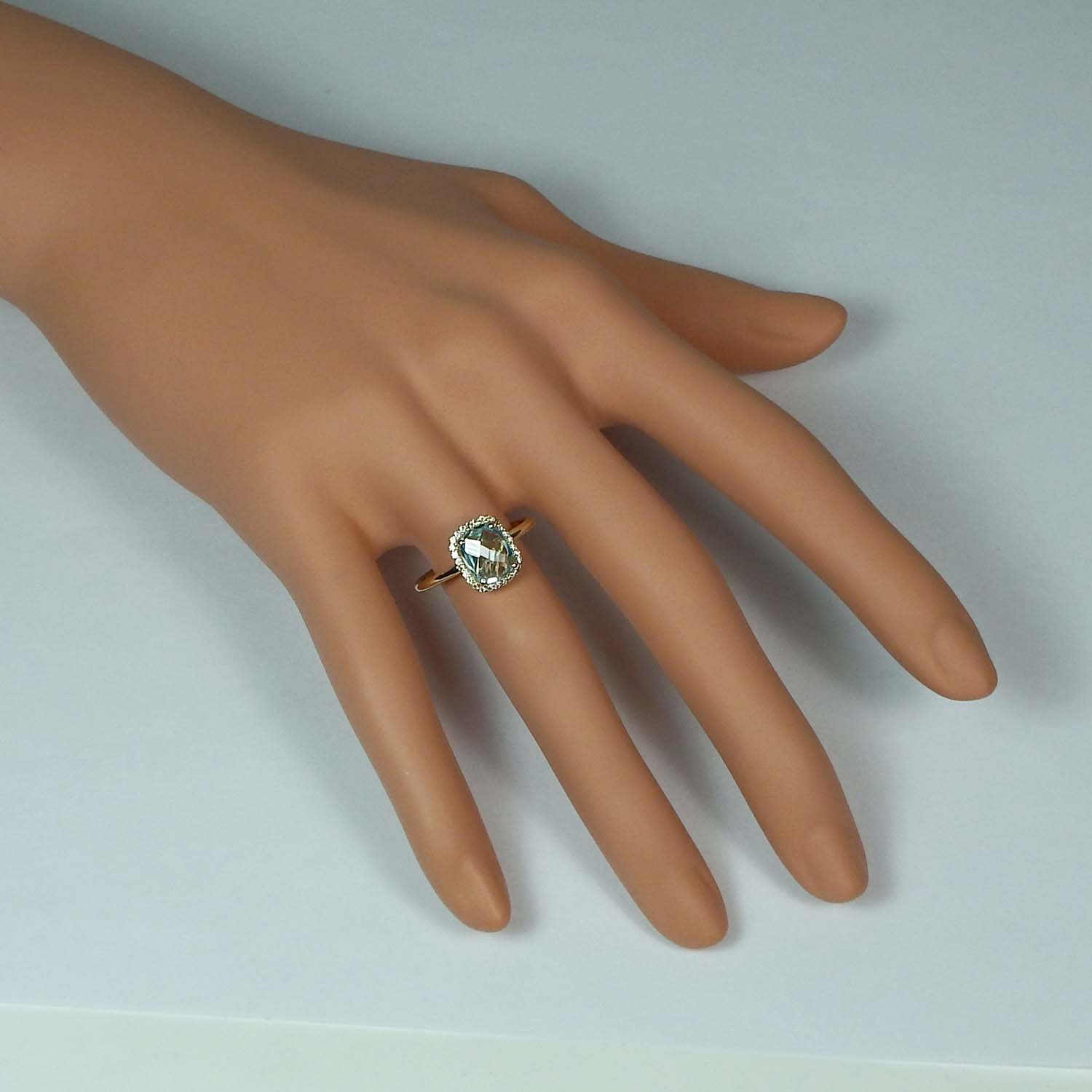 Der facettierte Blautopas ist eingefasst von vielen, funkelnden Zirkonia.