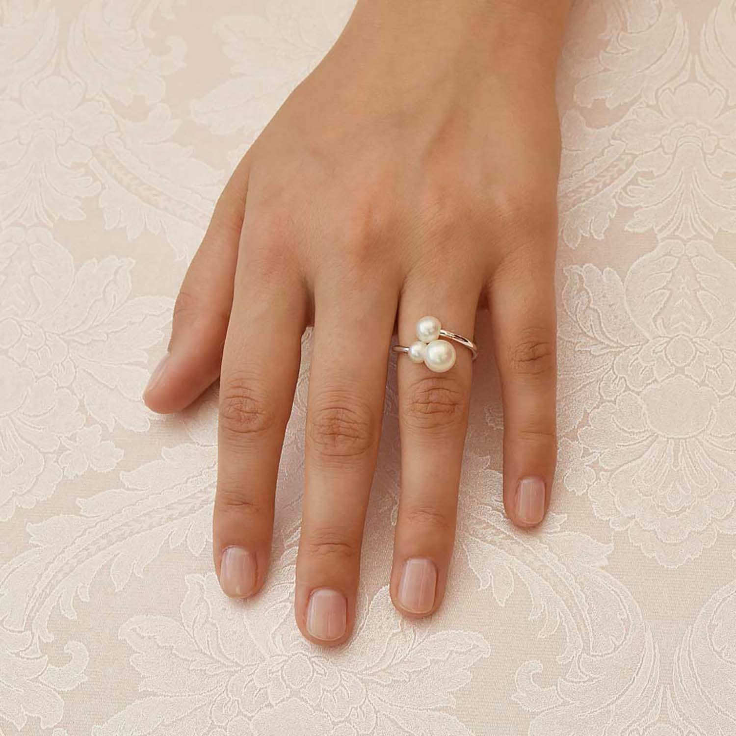 Der Damenring aus rhodiniertem Sterlingsilber zeigt eine moderne Interpretation von Perlschmuck.