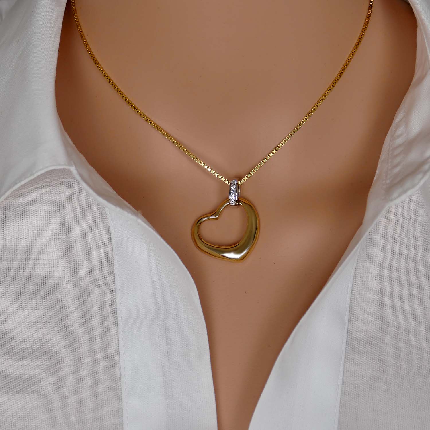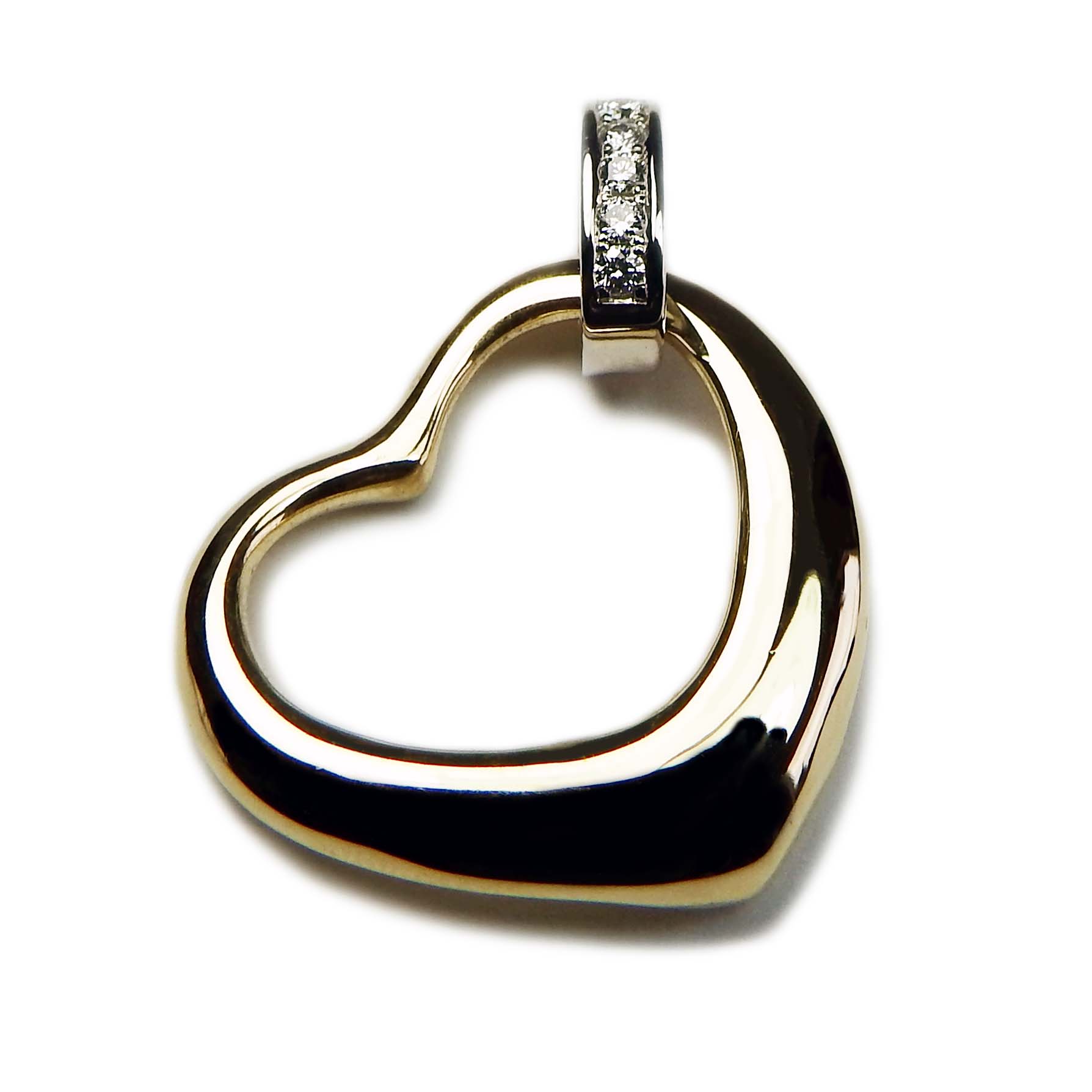 Ein hochwertiger Herz-Anhänger aus unserer Goldschmiede. Der massive Anhänger wurde in Gelbgold und Weißgold 585/000 gearbeitet. Die mit fünf Brillanten im Verschnitt ausgefasst Weißgoldöse ist auf dem Herz frei beweglich. Die Brillanten haben ein Gesamtgewicht von 0,10 ct.und eine sehr schöne Farbe (top wesselton) und Reinheit (si).