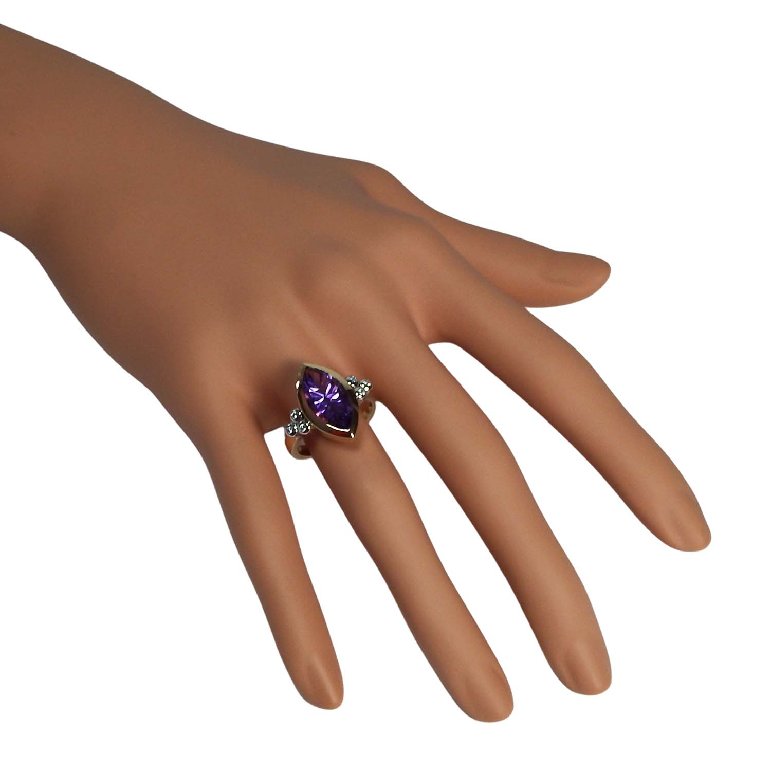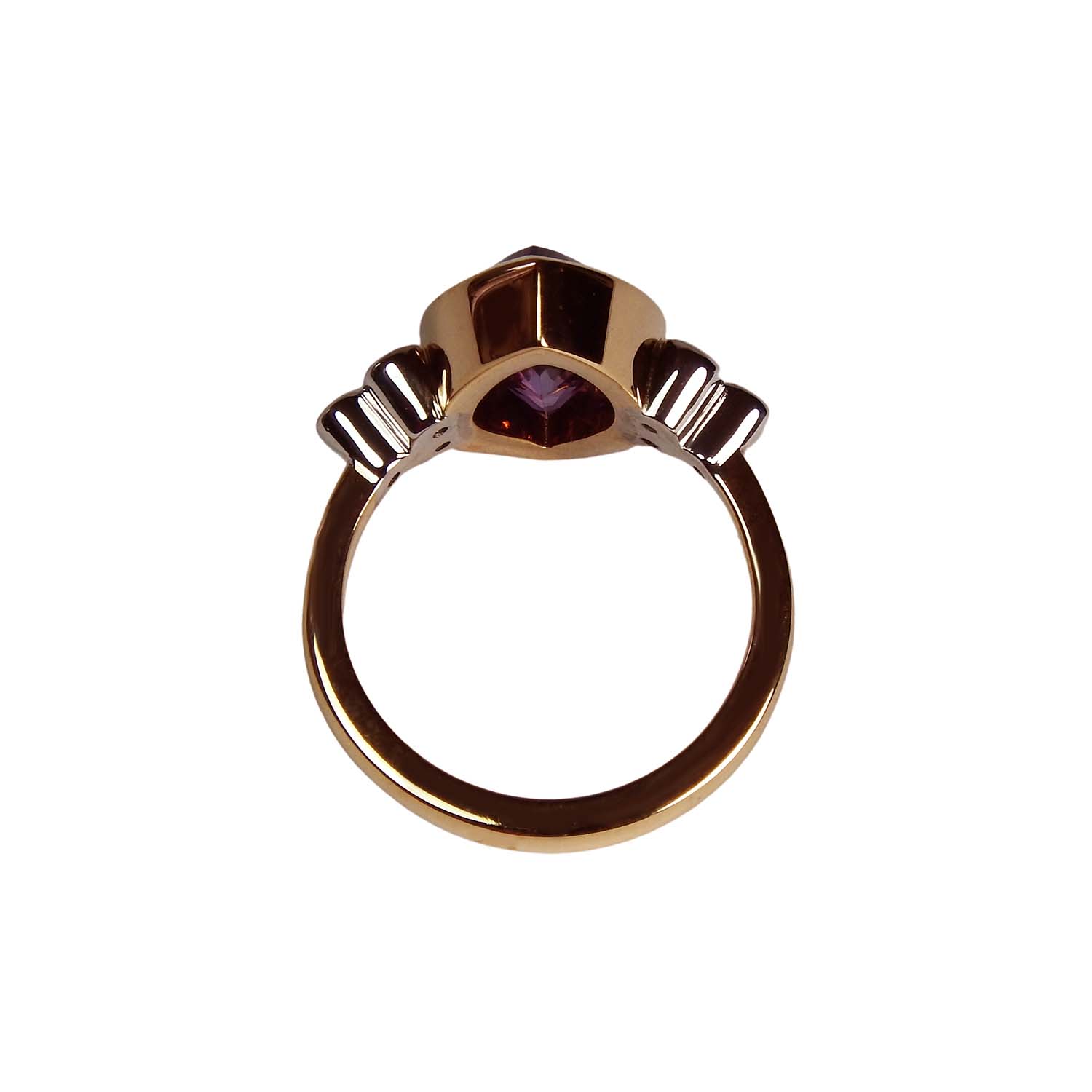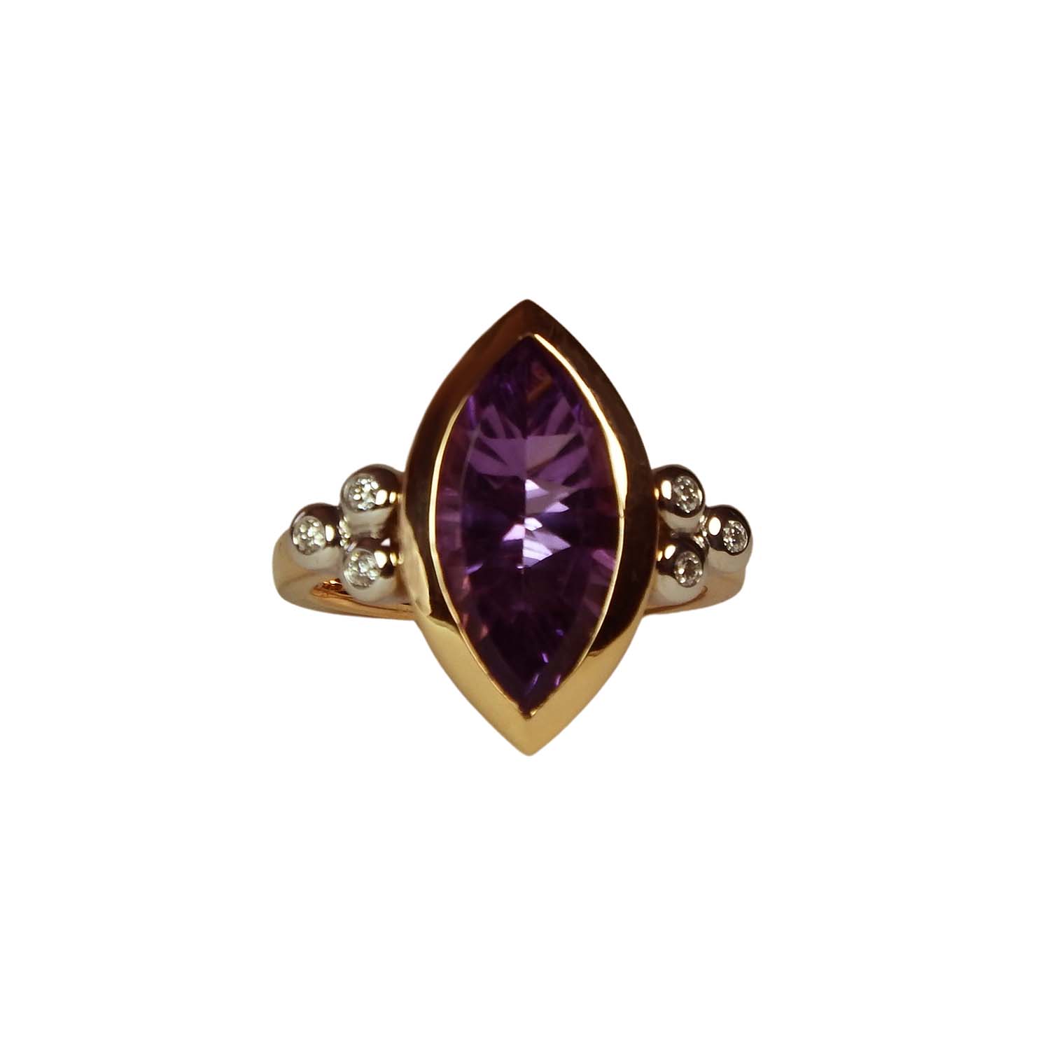 750er Roségold und Weißgold bilden einen extravaganten Kontrast zu dem Lila des navetteförmig geschliffenen Amethysts.