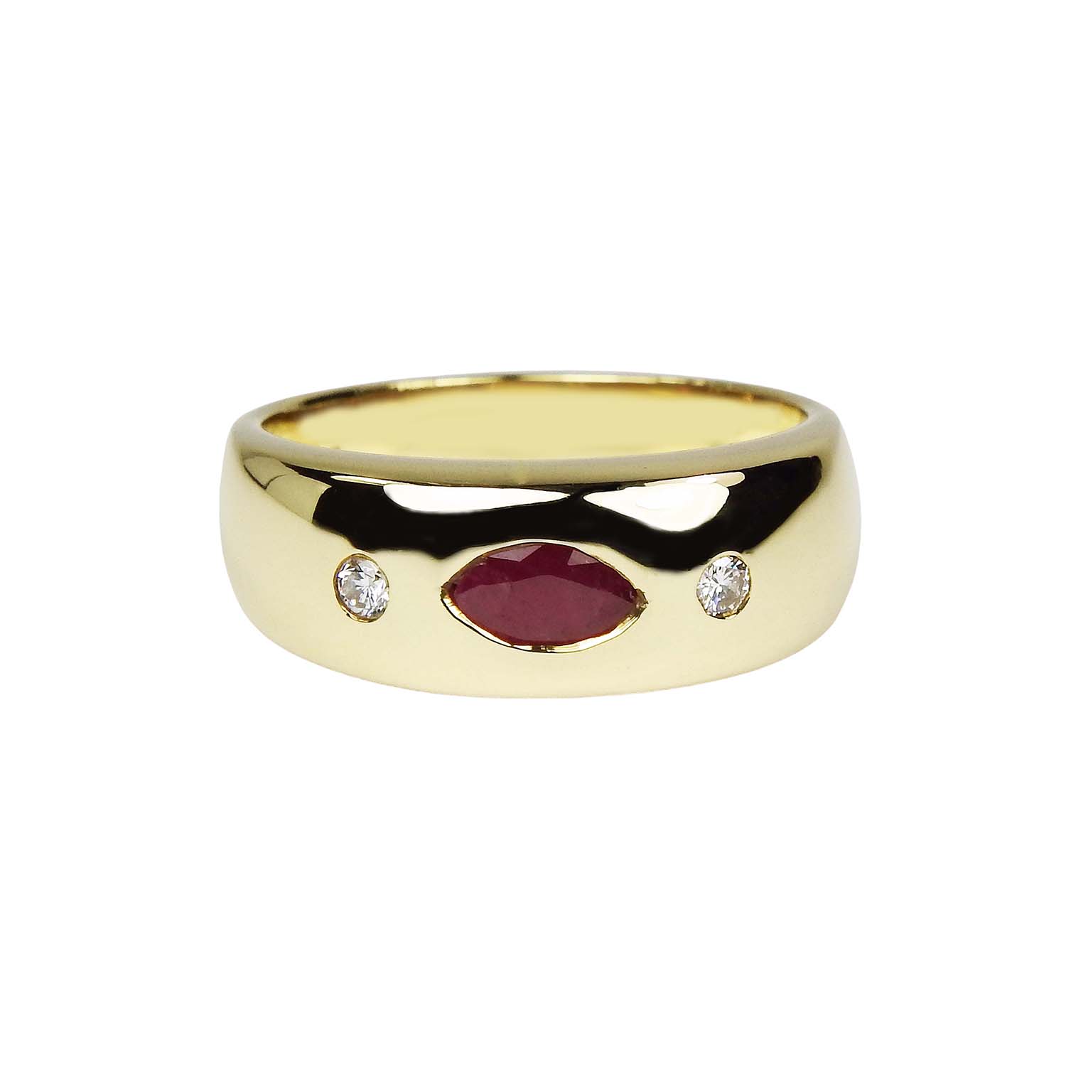 Der navetteförmig geschliffene Rubin wird von zwei Brillanten eingerahmt.