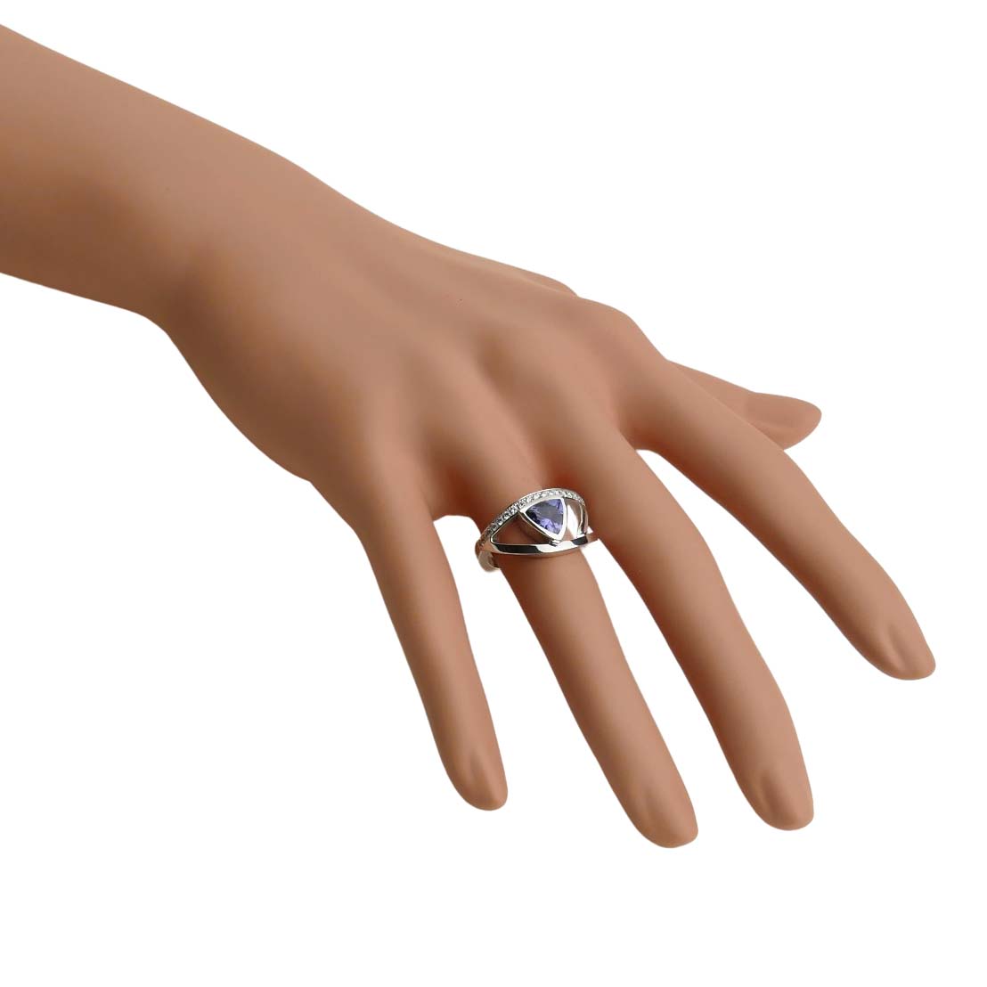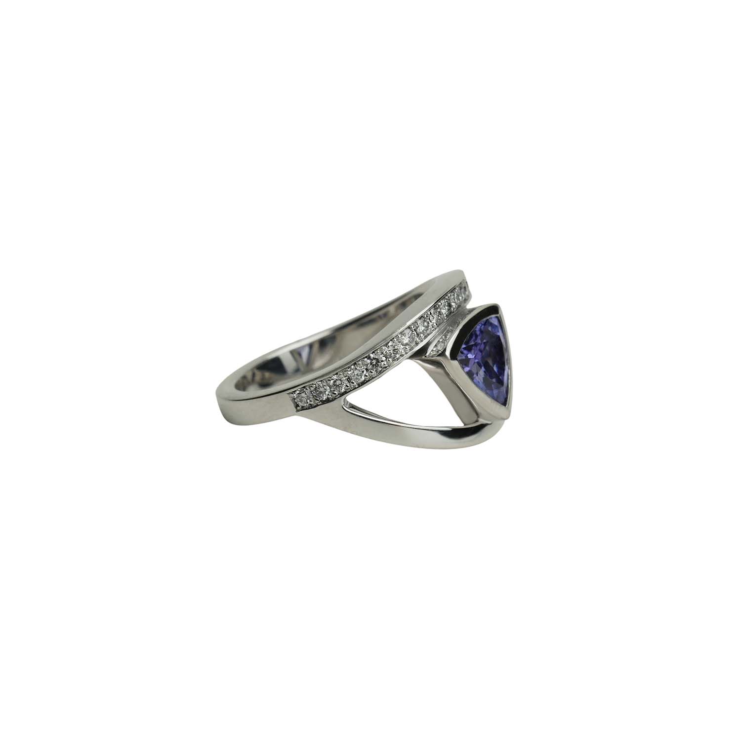 Die Tansanittriangel (7 mm) wurde asymmetrisch in den Ring gesetzt und leuchtet in strahlendem Blau.