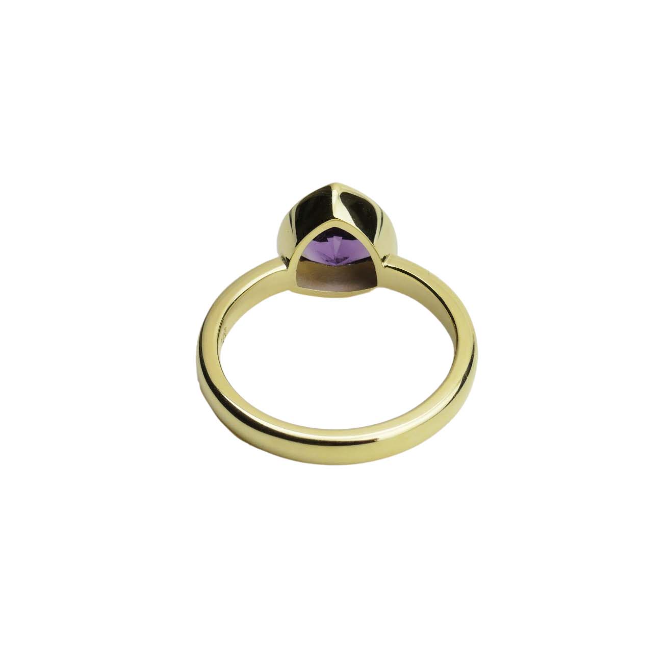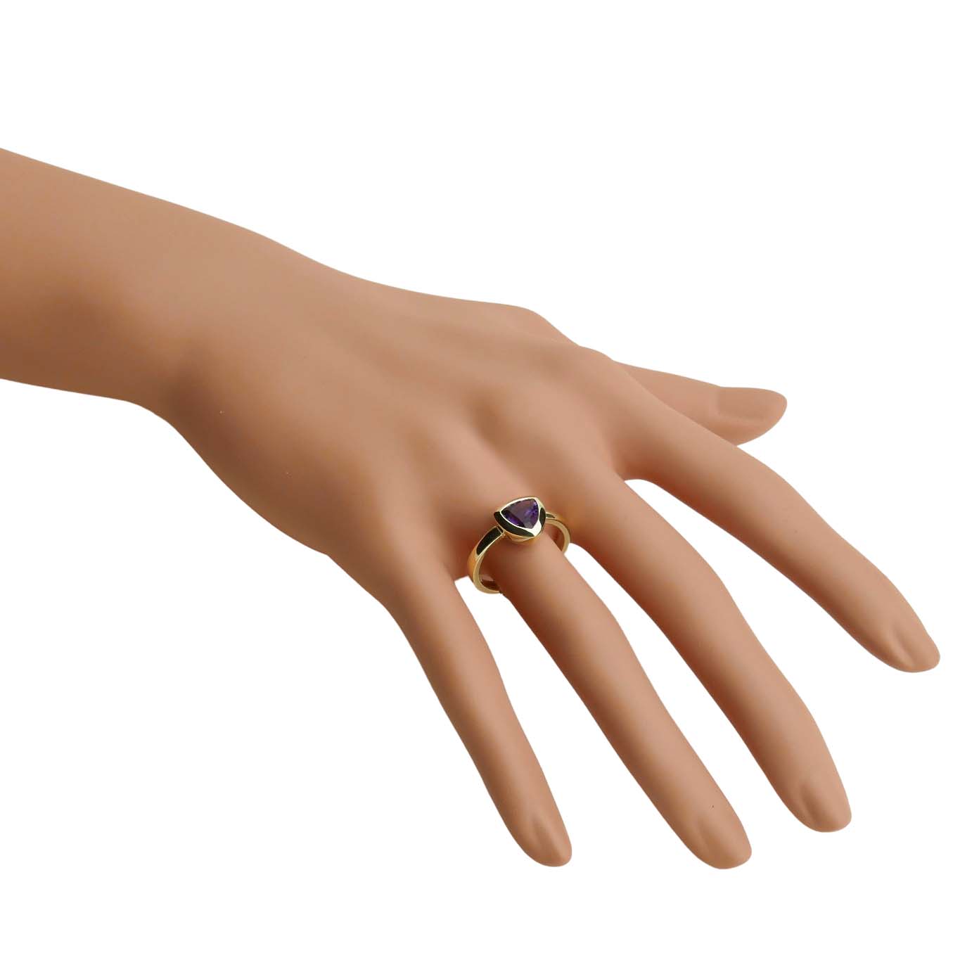 Die Amethysttriangel (7mm) ist sicher in einer schlichten Zarge gefasst und leuchtet in einem intensiven Lila.