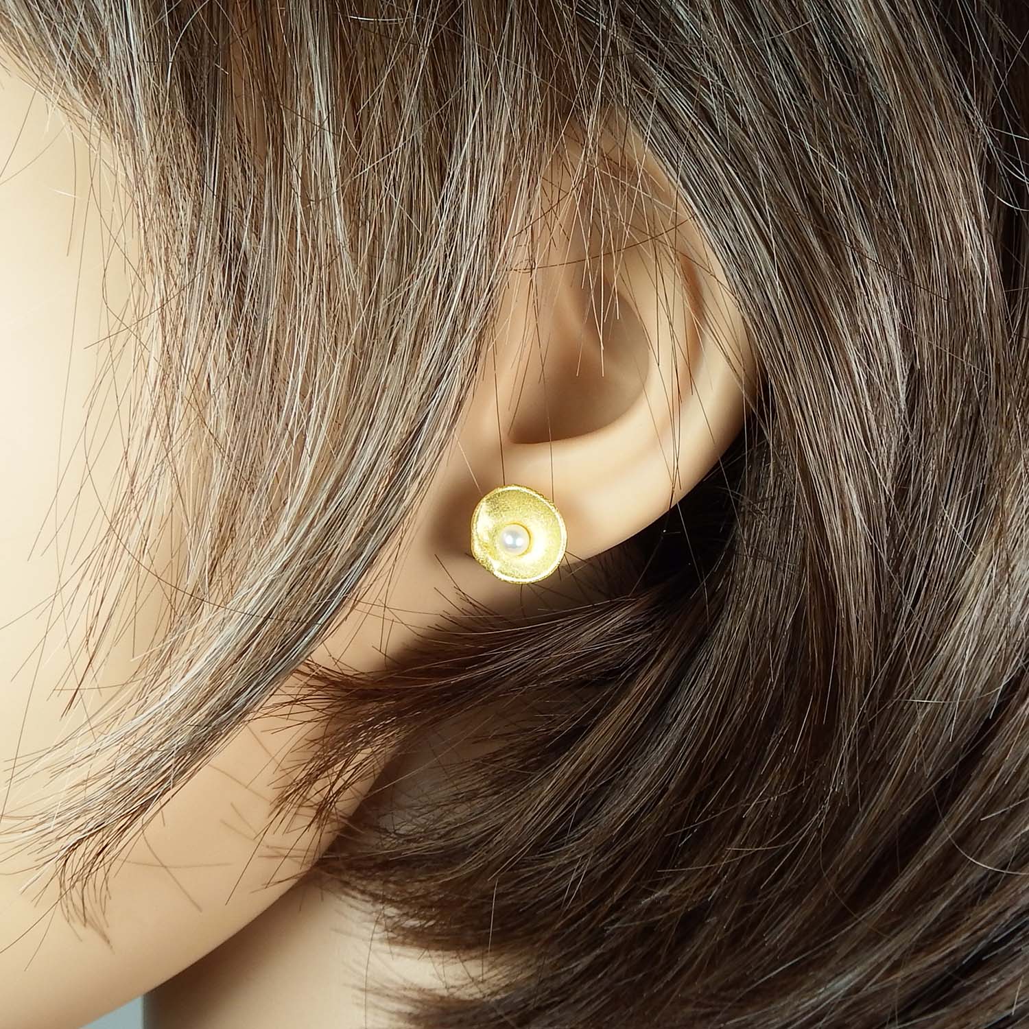 Die handwerklichen Perlohrstecker Clamis von Bernd Wolf sind mit kleinen weißen Süßwasserperlen besetzt. Die Ohrringe aus vergoldetem Sterlingsilber haben einen Durchmesser von 10 mm.