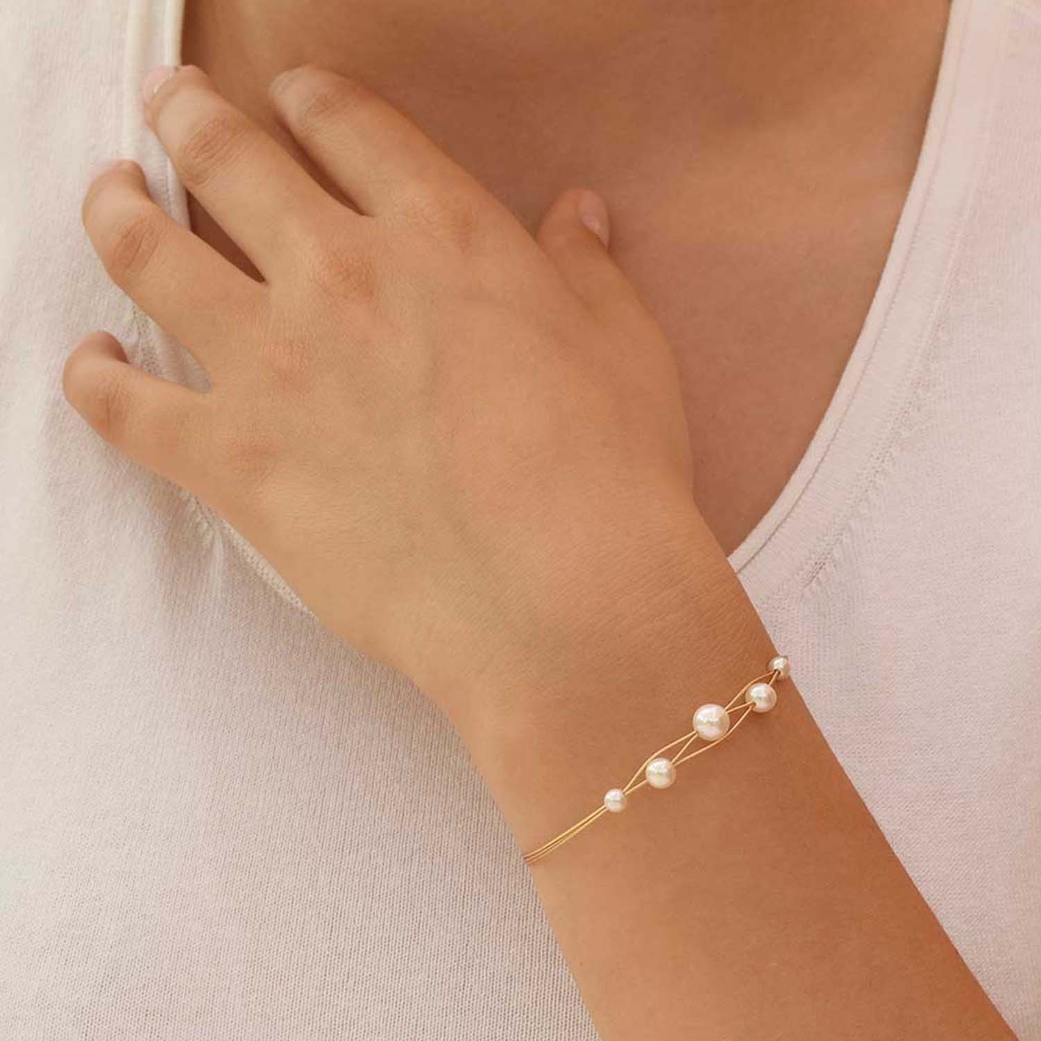 Fünf weiße Süßwasserperlen der besten Qualität wurden auf drei feine vergoldete Stahlseilchen gezogen und geben dem Armband eine verspielte Leichtigkeit.