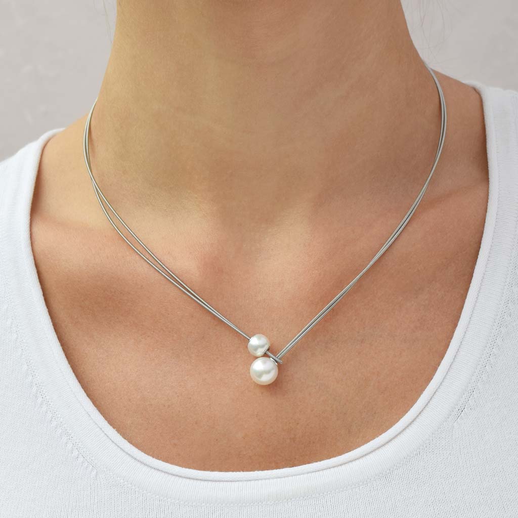 Die Zuchtperlen, die auf zwei Stahlseile gezogen wurden, haben einen fantastischen Lüster. Die Durchmesser betragen 6 und 9 mm.