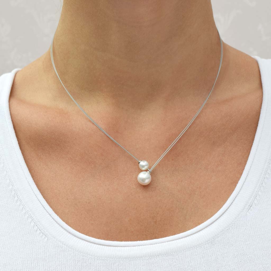 Die Zuchtperlen, die auf zwei Stahlseile gezogen wurden, haben einen fantastischen Lüster. Die Durchmesser betragen 5 und 7,5 mm.