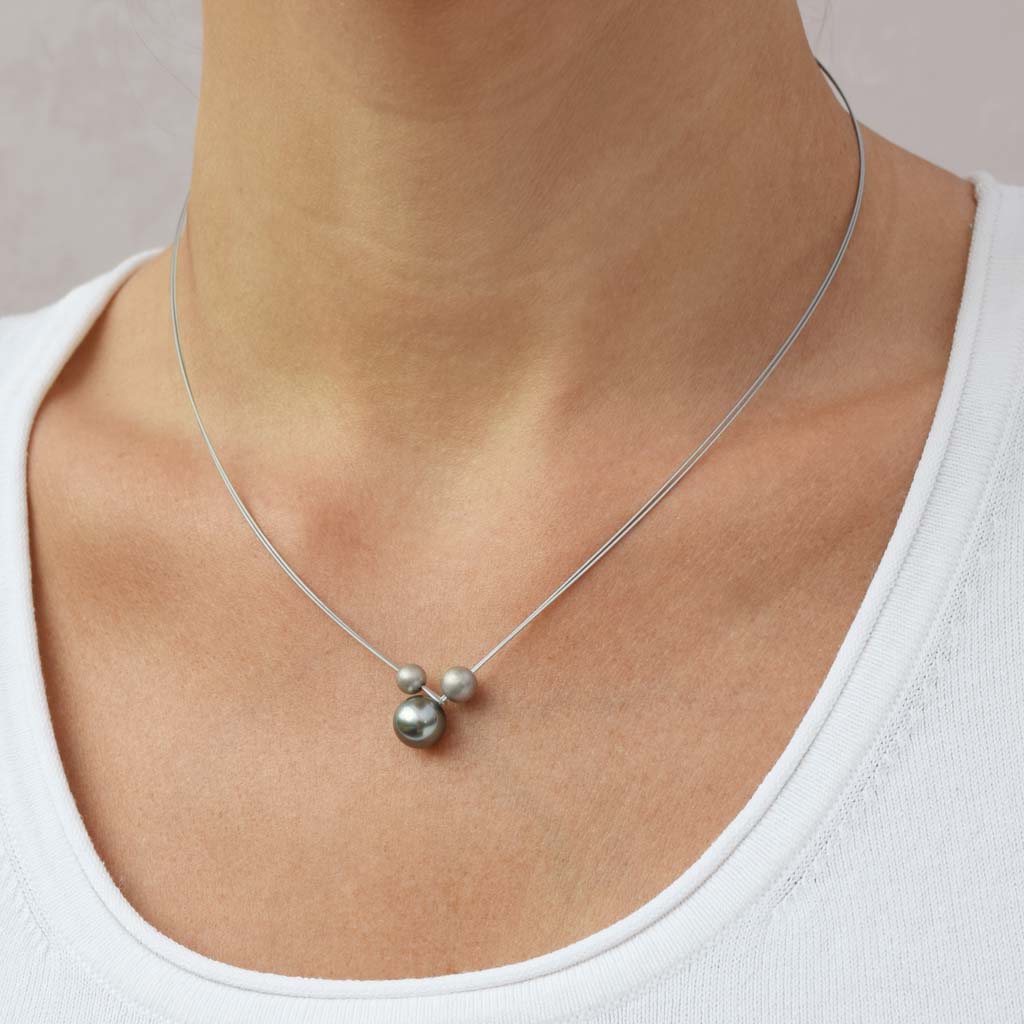 Das Collier Tahiti Trio aus der Kollektion von Eva Strepp lenkt mit seinem klaren Design die Aufmerksamkeit auf die makellose Tahitiperle.