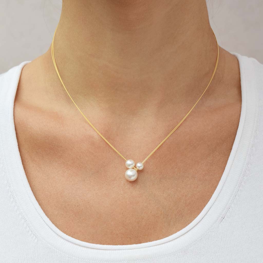 Das Collier Trio aus der Kollektion von Eva Strepp lenkt mit seinem klaren Design die Aufmerksamkeit auf die makellosen weißen Süßwasserperlen.