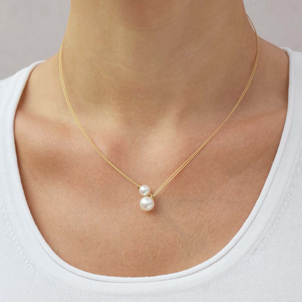 Die Zuchtperlen, die auf zwei Stahlseile gezogen wurden, haben einen fantastischen Lüster. Die Durchmesser betragen 6 und 9 mm.