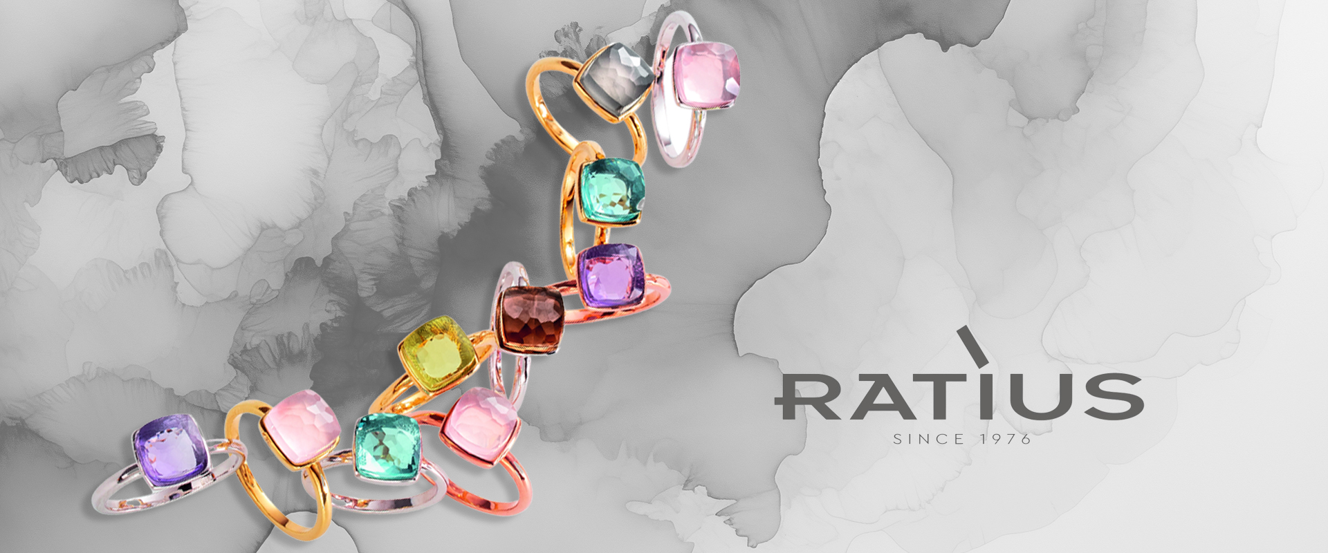 Der Ring aus goldplattiertem Sterlingsilber von Ratius sieht einzeln oder mit mehreren Ringen dieser Art zusammen getragen, einfach glamourös aus. Auch vor den Trauring gesetzt, entwickelt er eine brillante Optik.
