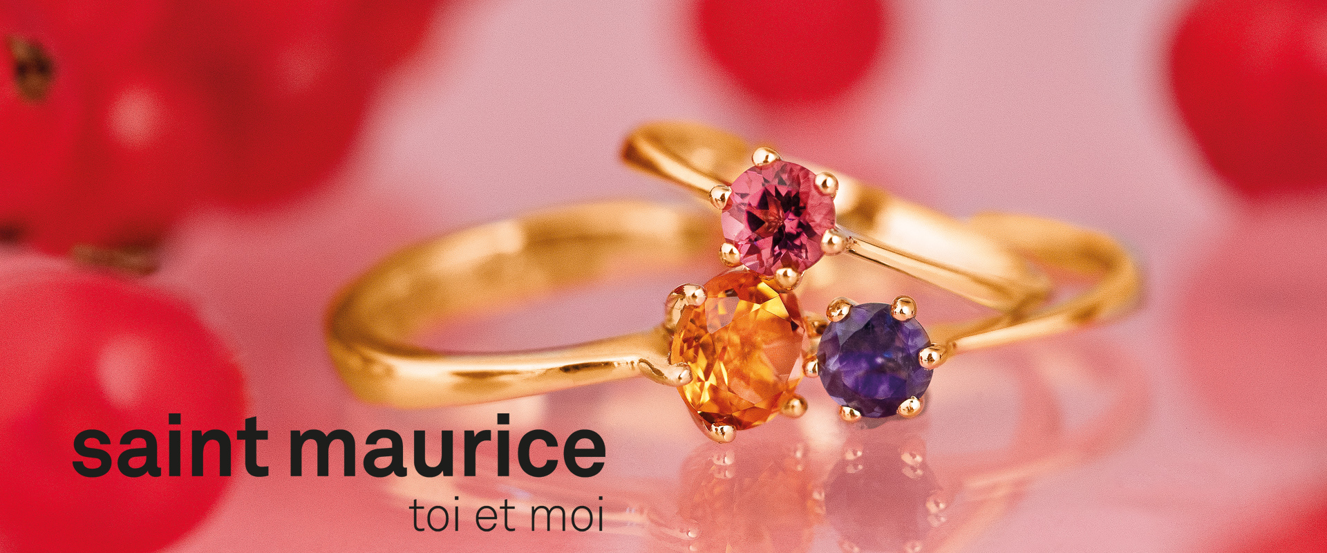 Beim Thema Farbe wird es ganz fröhlich und bunt. Längst werden nicht nur Diamanten bevorzugt, sondern auch kräftig leuchtende Edelsteine. Das Spektrum bei Saint Maurice ist sehr breit: Aquamarine, Citrine, Peridots, Iolithe, Turmaline, Rauchquarze, Rhodolithe und Amethyste strahlen um die Wette.