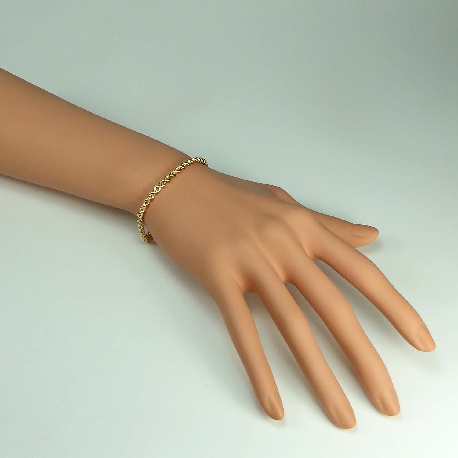 Das Kordelarmband aus Gelbgold 375/000 ist 3,3 mm breit und 19 cm lang.