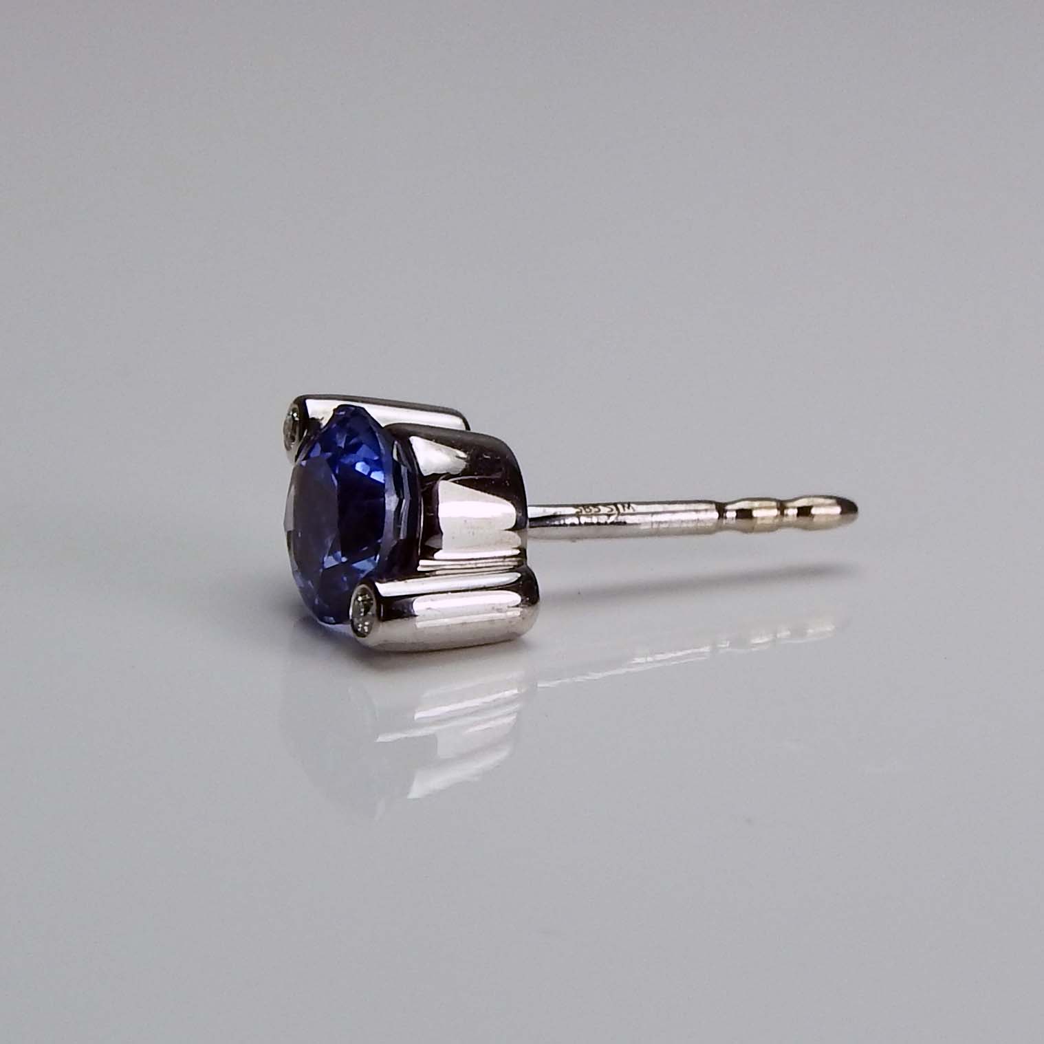 Die hochwertigen, farbintensiven Safire (insgesamt 2,62 ct.) haben einen Durchmesser von 5 mm und werden jeweils von zwei kleinen Diamanten eingerahmt (insgesamt 0,02 ct., w/si).