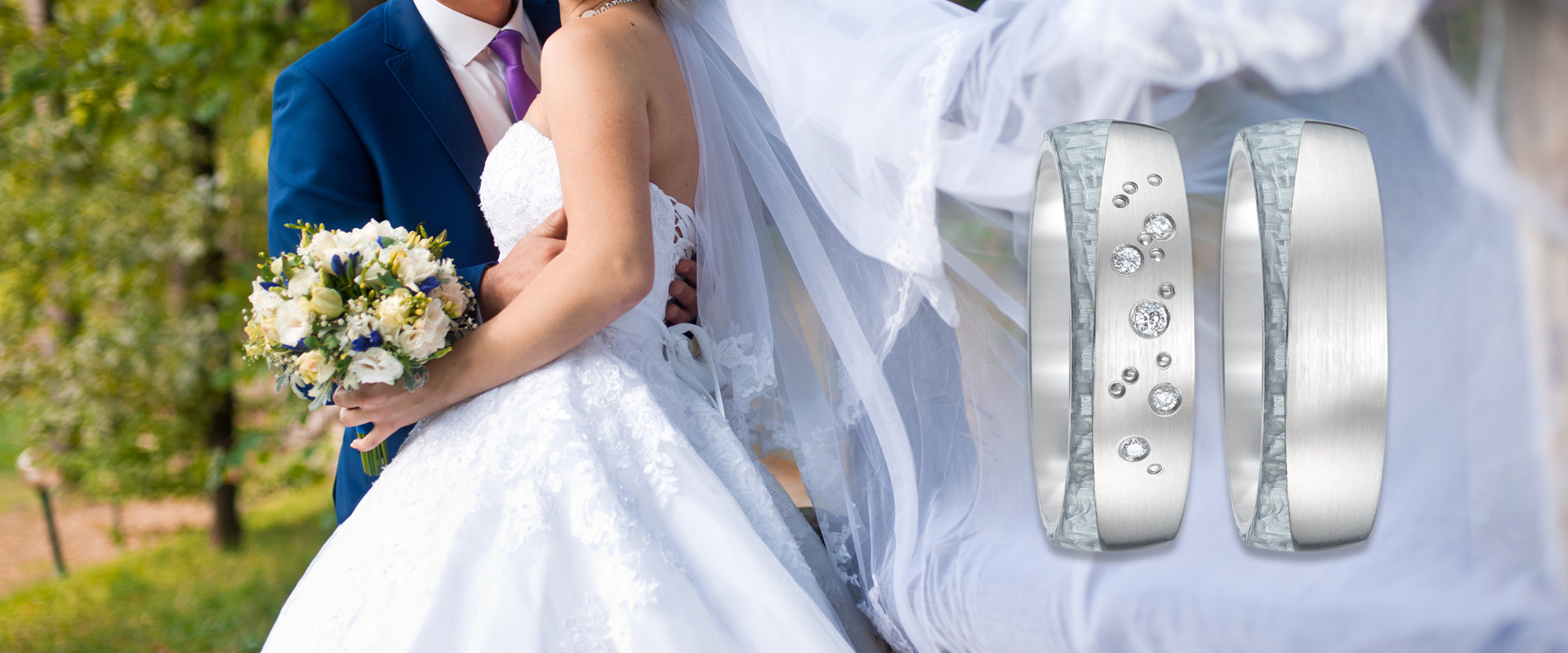 Ein Trauring mit Brillanten von Titan Factory in ganz neuer Optik: hellgraues Carbon kombiniert mit strichmattem Titan. Die fünf Brillanten wiegen insgesamt 0,06 ct., die Farbe ist wesselton, die Reinheit si. Der Ring ist 6 mm breit und 2,1 mm hoch. Durch die Bombierung von innen bietet er einen hohen Tragekomfort.