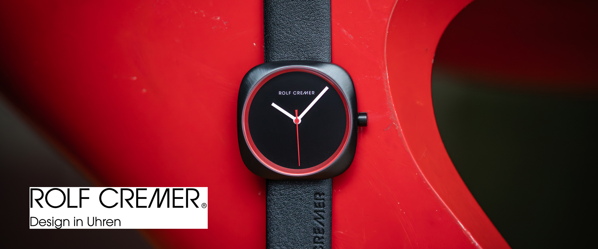 Das extravagante Gehäuse aus mattiertem, dunklen Titan im typischen Rolf-Cremer-Design wird hier kontrastreich mit einem roten Lederband aufgepeppt. Ein liebevolles Detail sind die farblich zum Lederband passenden Zeiger.