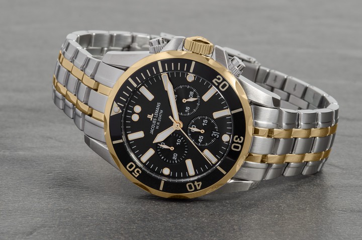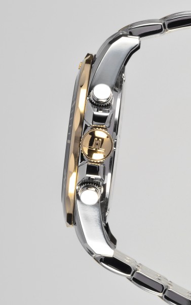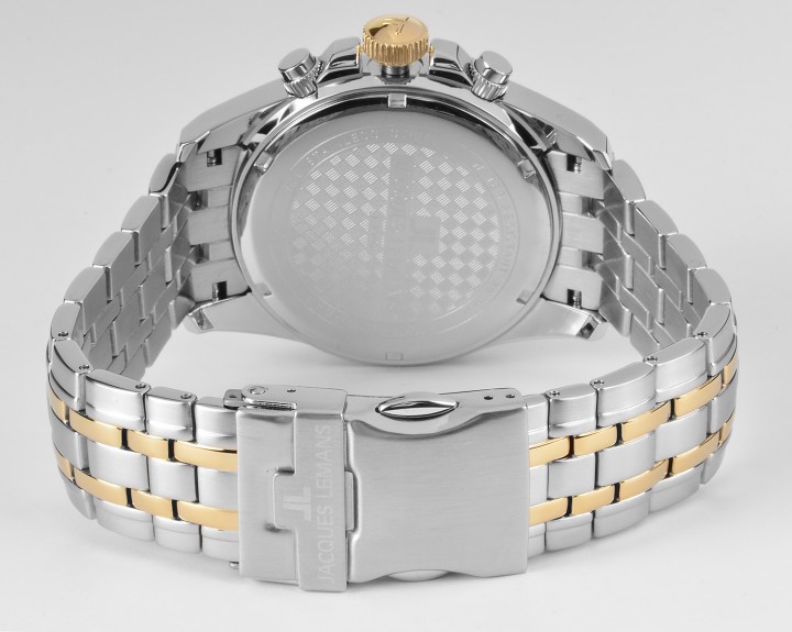 Ein sehr markanter und gut ablesbarer Chronograph von Jacques Lemans! Die schwarze Lünette, die weißen Indizes und Zeiger betonen das eindrucksvolle Design des Modells Liverpool. die Uhr hat eine Wasserdichte von 200 m.