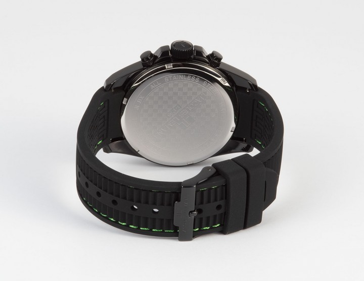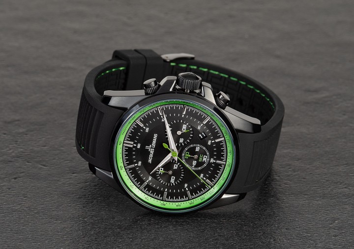 Robuster, wasserdichter Chronograph von Jacques Lemans. Das Modell Liverpool ist wegen des verschraubten Gehäuses, der Wasserdichtigkeit von 100 m und des Silikonbandes besonders für Wassersportler zu empfehlen. Der markante Look entsteht durch das schwarz ionenplattierte Gehäuse und die grüne Tachymeterskala.