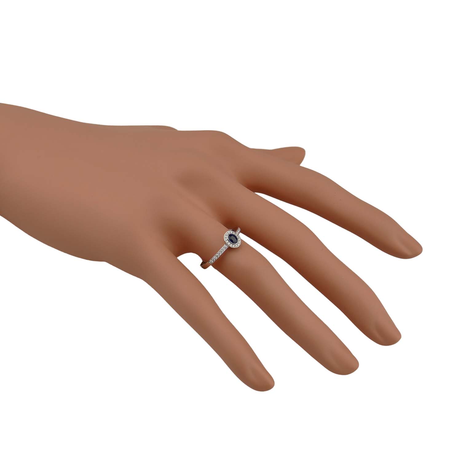 Der facettierte, ovale Safir wird umgeben von 32 Brillanten der Qualität w/si (zus. 0,095 ct.).