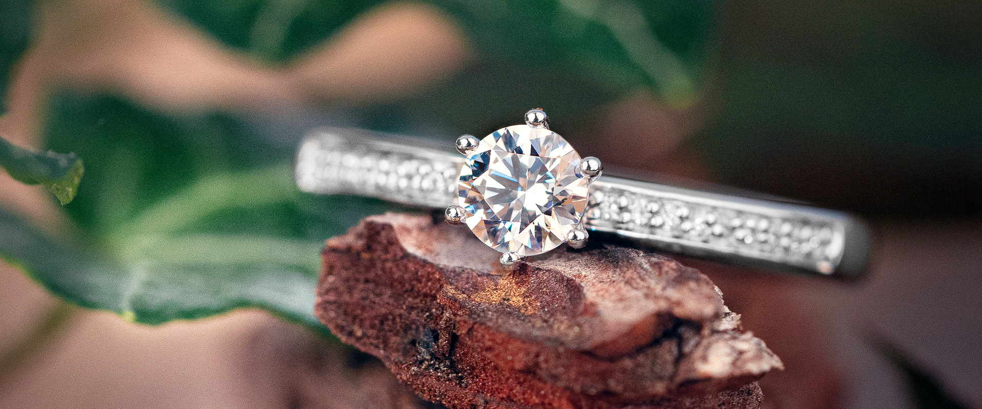 Der durch die Spannung des Platins sicher gehaltene Stein wirkt wie frei schwebend und erhält so seine optimale Brillanz.